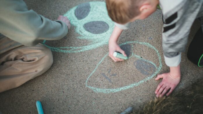 Man and boy sit on a paved sidewalk and draw alien faces.