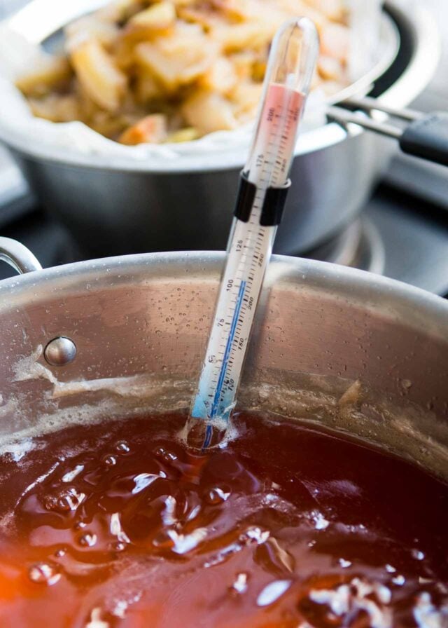 The next day, measure out the juice. You should have about 8 cups (2L) but may get a little more. Pour the juice into a large, non-reactive pot fitted with a candy thermometer, add the sugar and lemon juice, and bring to a boil. During cooking, as any white foam forms on the surface while the jelly is cooking, gently skim it off with a ladle. (See Note at the end of the recipe for some idea about repurposing the apples and the foam.)