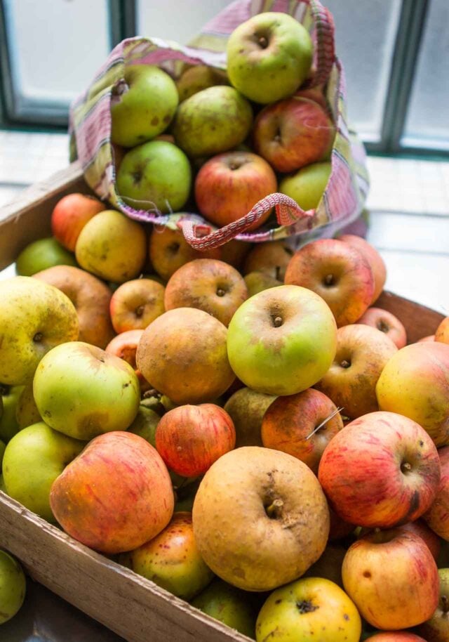 To make Apple Jelly, it’s probably a good idea to either a friend with an apple tree (with an explanation ready in case a neighbor comes by…) or get apples from a source where they might sell you apples that are dented or dinged, which are called pommes à cuire (cooking apples) in France, and are quite popular. At the markets, those apples are usually the first to get sold as people use the bargain beauties to make compotes and tarts with. And French bakers like to use a variety of apples in dessert, like Apple Cake, as the flavor is more interesting than if using just one variety.