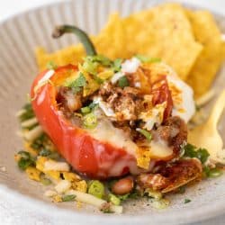These chili stuffed peppers are a fun twist on serving a classic bowl of chili! Roasted peppers are stuffed with smoky chili, melty cheese and all the toppings to bring you a delicious, satisfying and cozy meal.