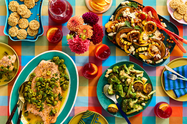 Putting together a party doesn’t have to be hard — and it shouldn’t be. You can be thoughtful and organized in such a way that your guests don’t know this effortless event was, in reality, well planned. When having a party, start with a menu like the fall one below, anchored by savory roasted salmon and surrounded by beautiful vegetables.