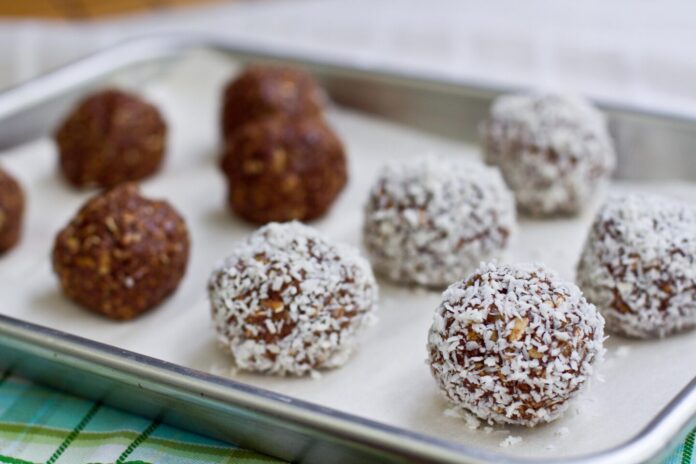 - With slightly wet hands, shape balls and roll in shredded coconut. Place balls on a parchment lined plate and freeze for 30-60 mins. If freezing for longer, allow to sit on the counter for 5 minutes or so to de-thaw slightly.