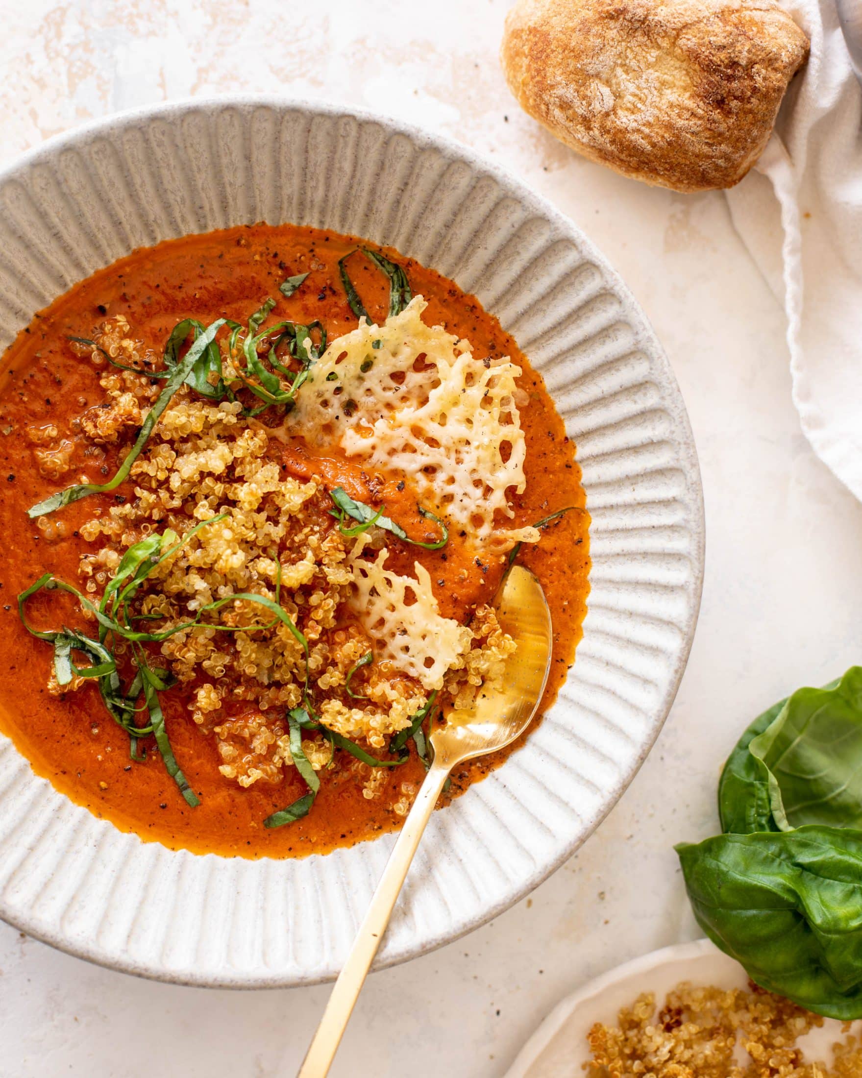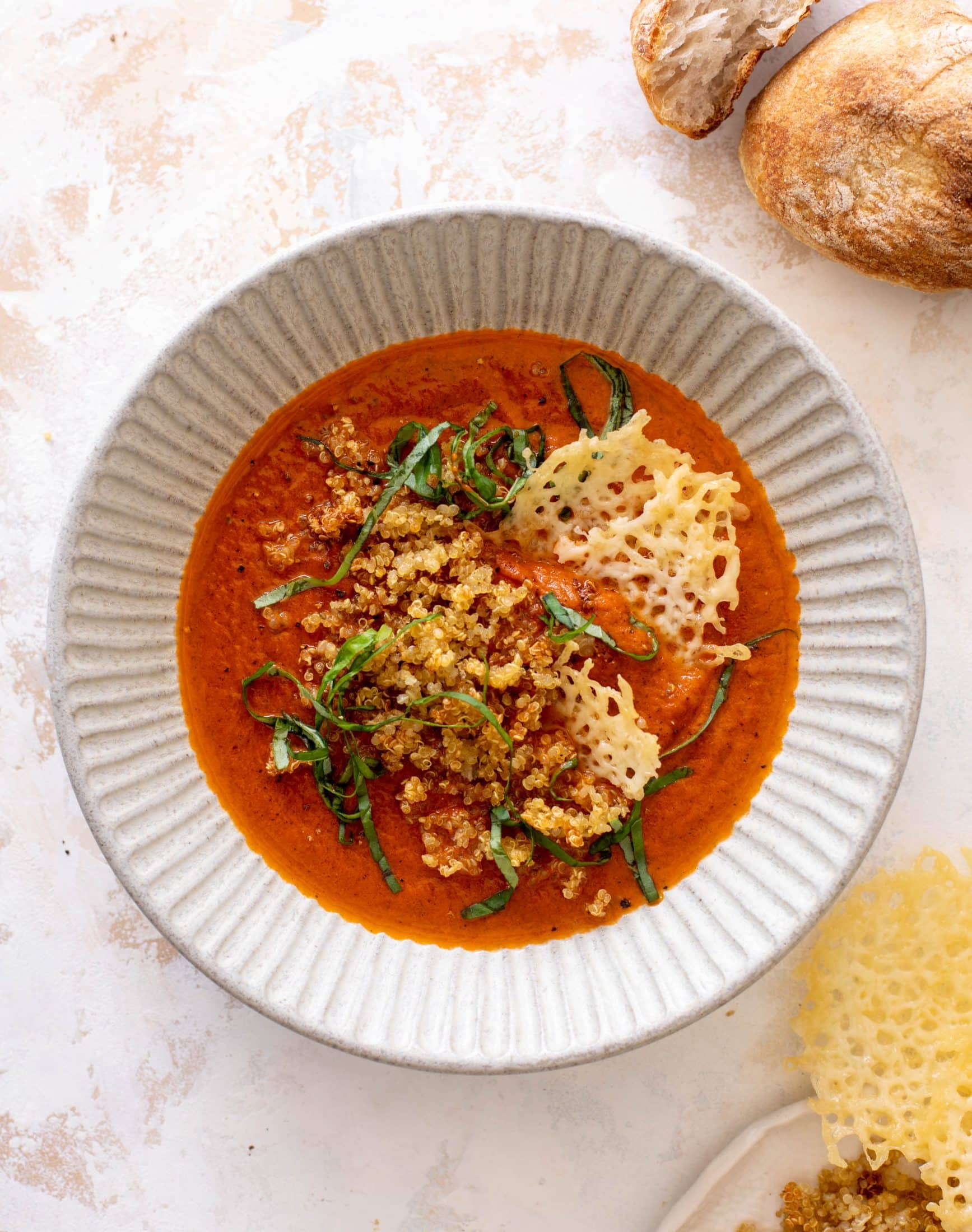 Serve the soup in bowls with a scoop of toasty quinoa, a few cheese crisps and fresh basil. Enjoy!