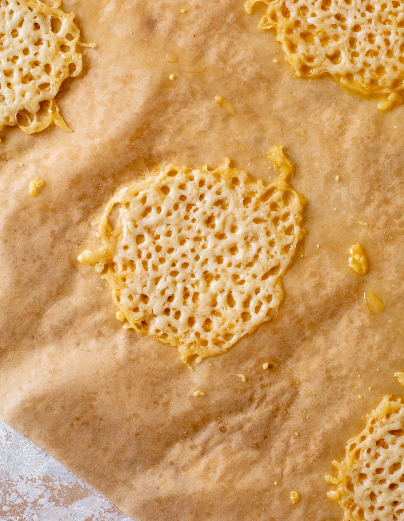 Drop small piles (about 2 tablespoons worth) of asiago cheese on the parchment paper 2 inches apart. Stick the pan in the oven and bake for 4 to 5 minutes, or until the cheese is melty and crisp. Remove and let cool for 10 minutes before removing the crisps from the pan.